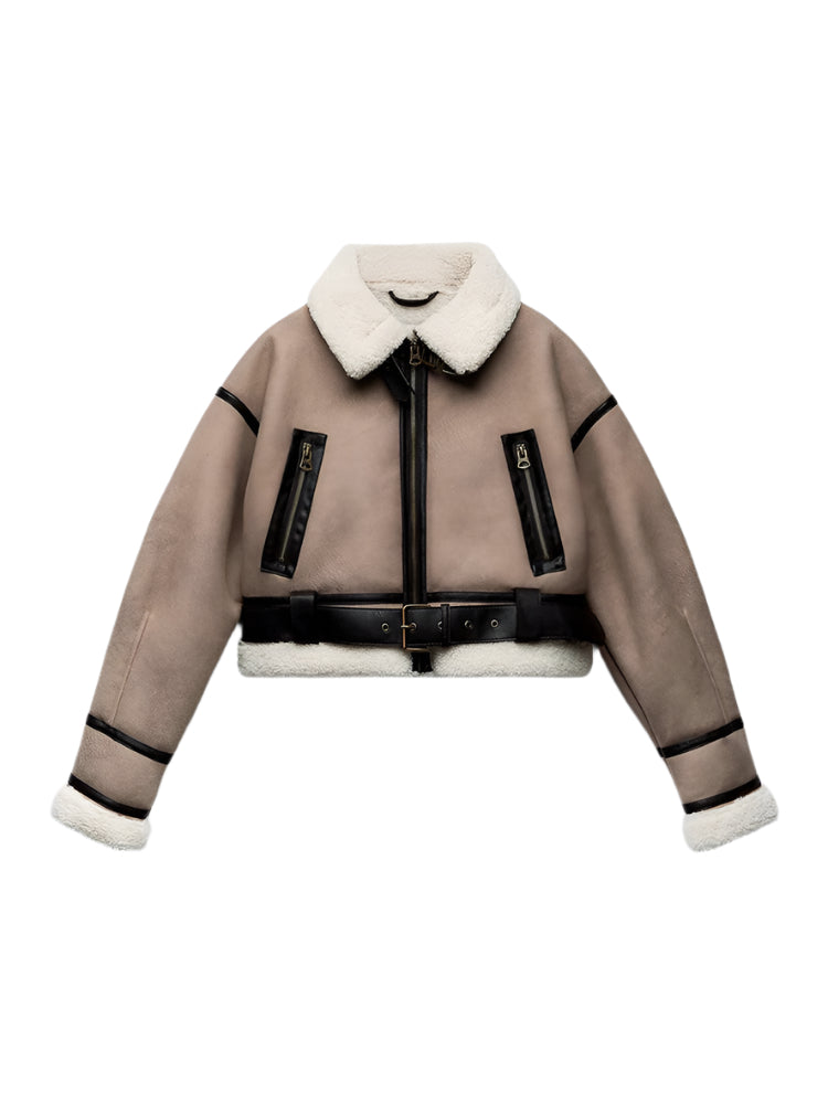 Shearling Lined Faux Leather Aviator Jacket - Women's Khaki Moto Coat with Belt